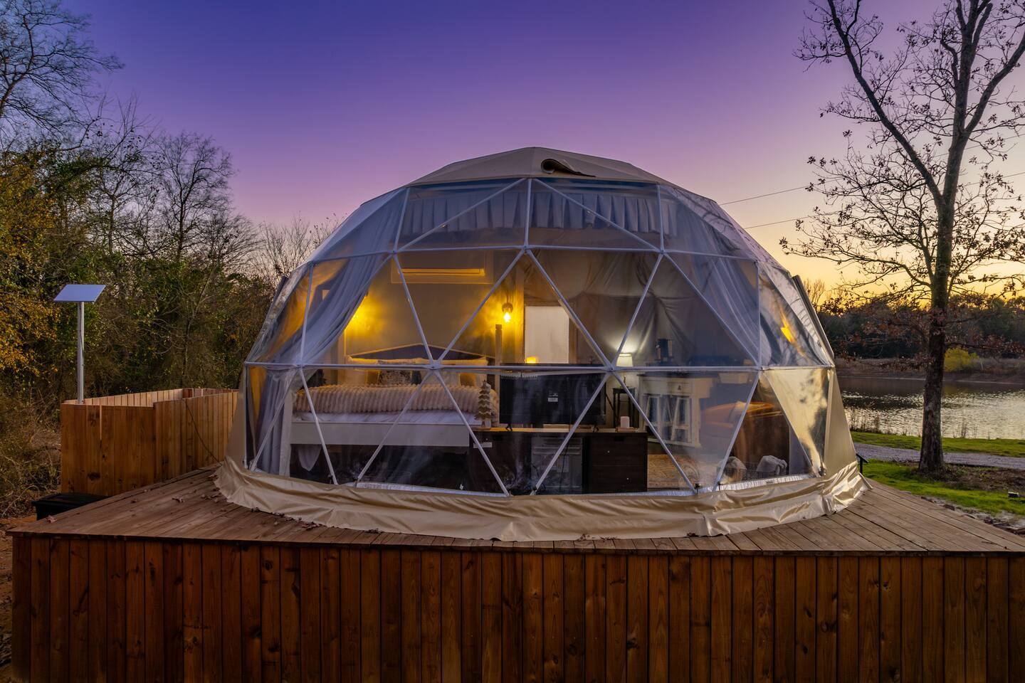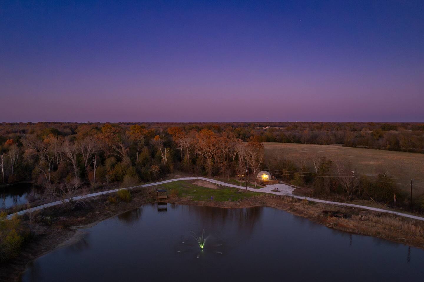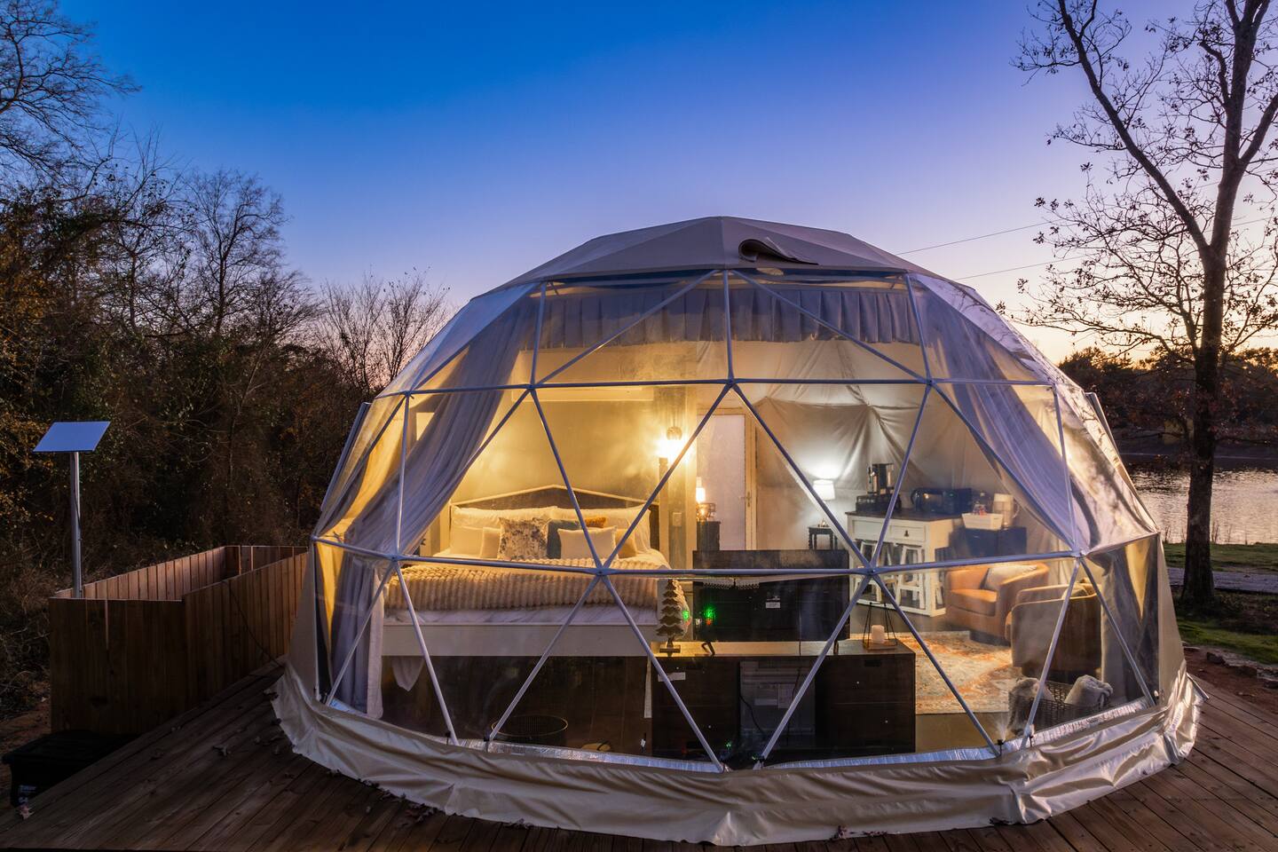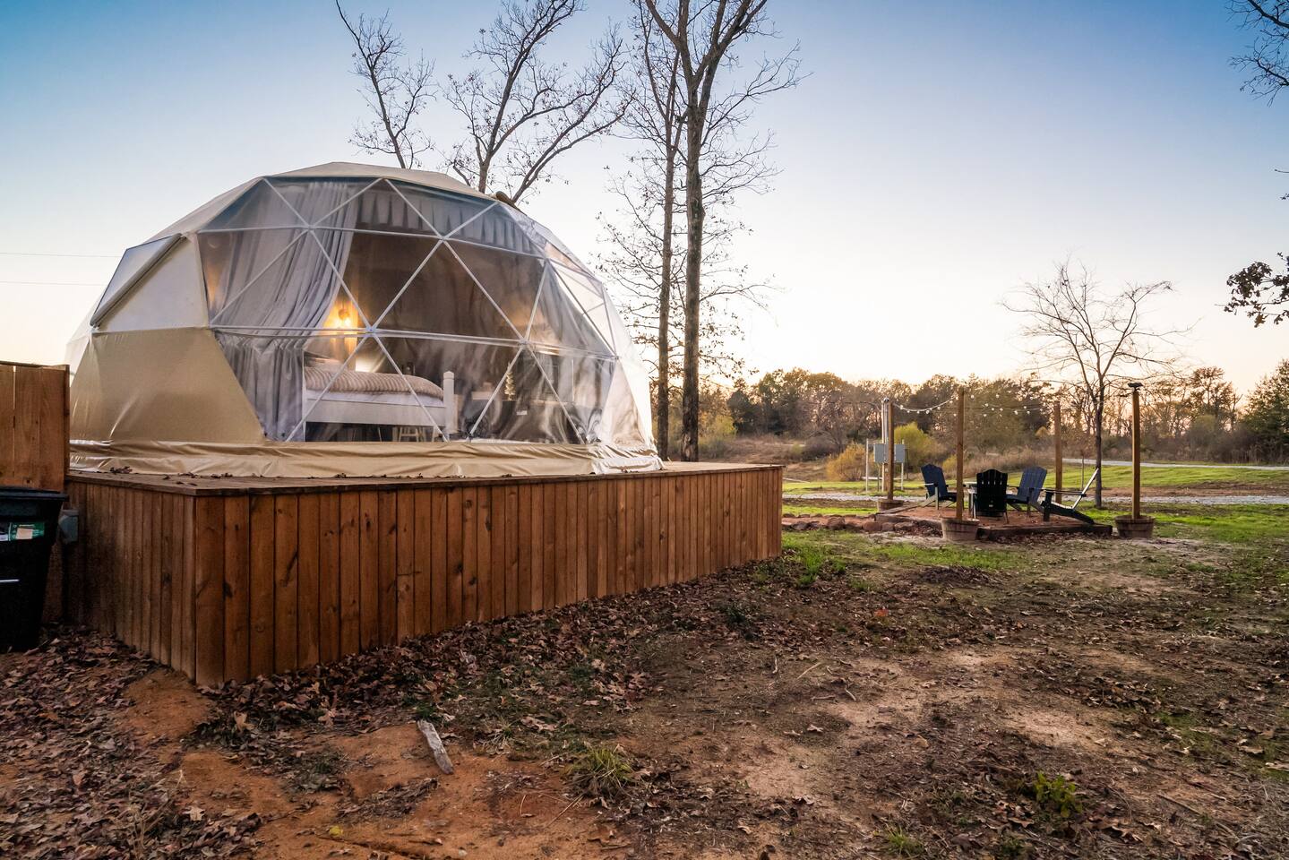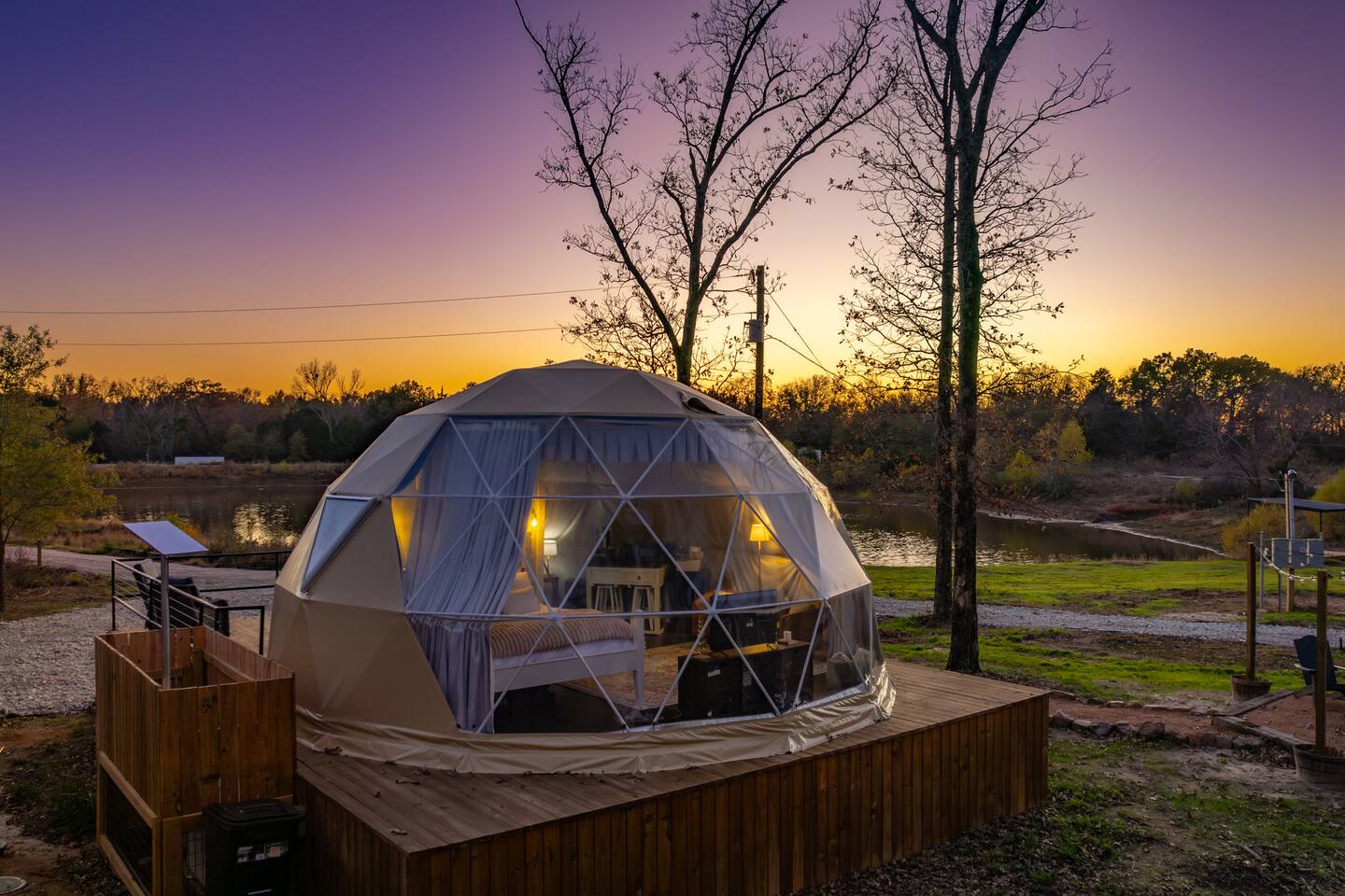 Grace Acres Sunset Dome Retreat Discover serenity at our enchanting geodesic dome, nestled on 65 private acres of woods, pastures, and tranquil ponds. This one-of-a-kind getaway seamlessly blends rustic charm with modern comforts, creating the ultimate retreat.