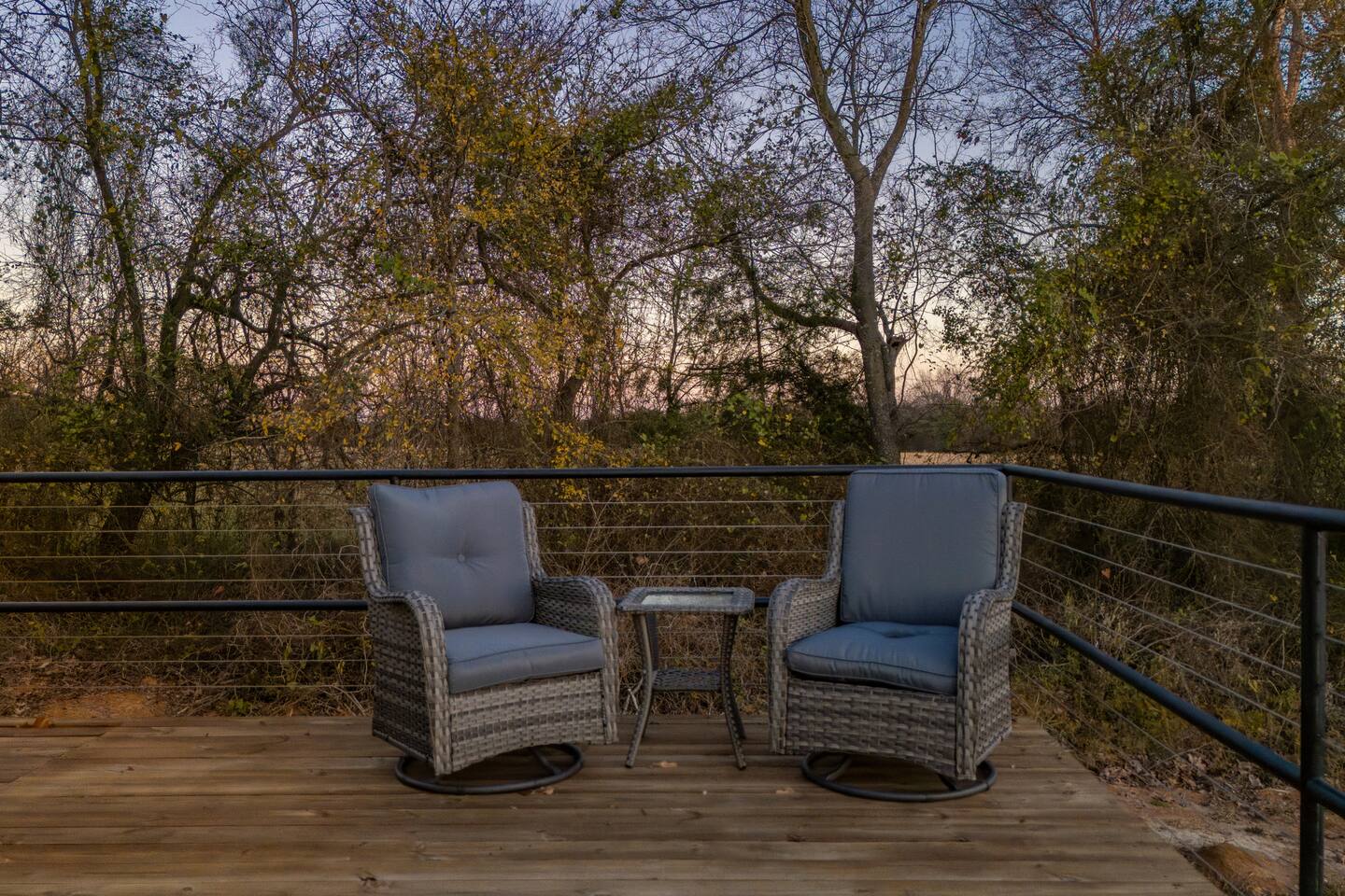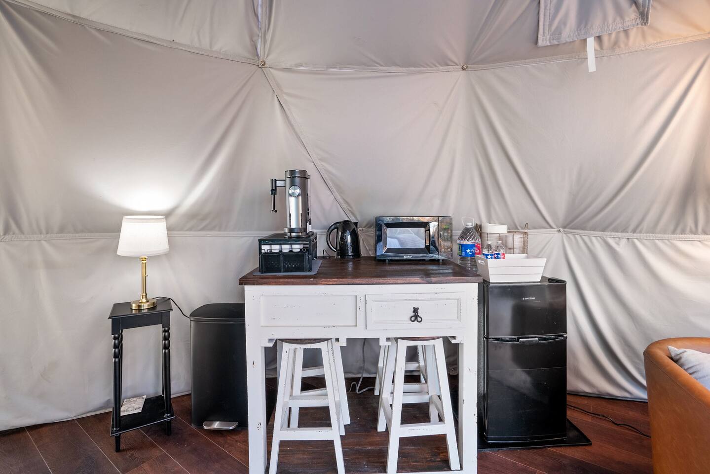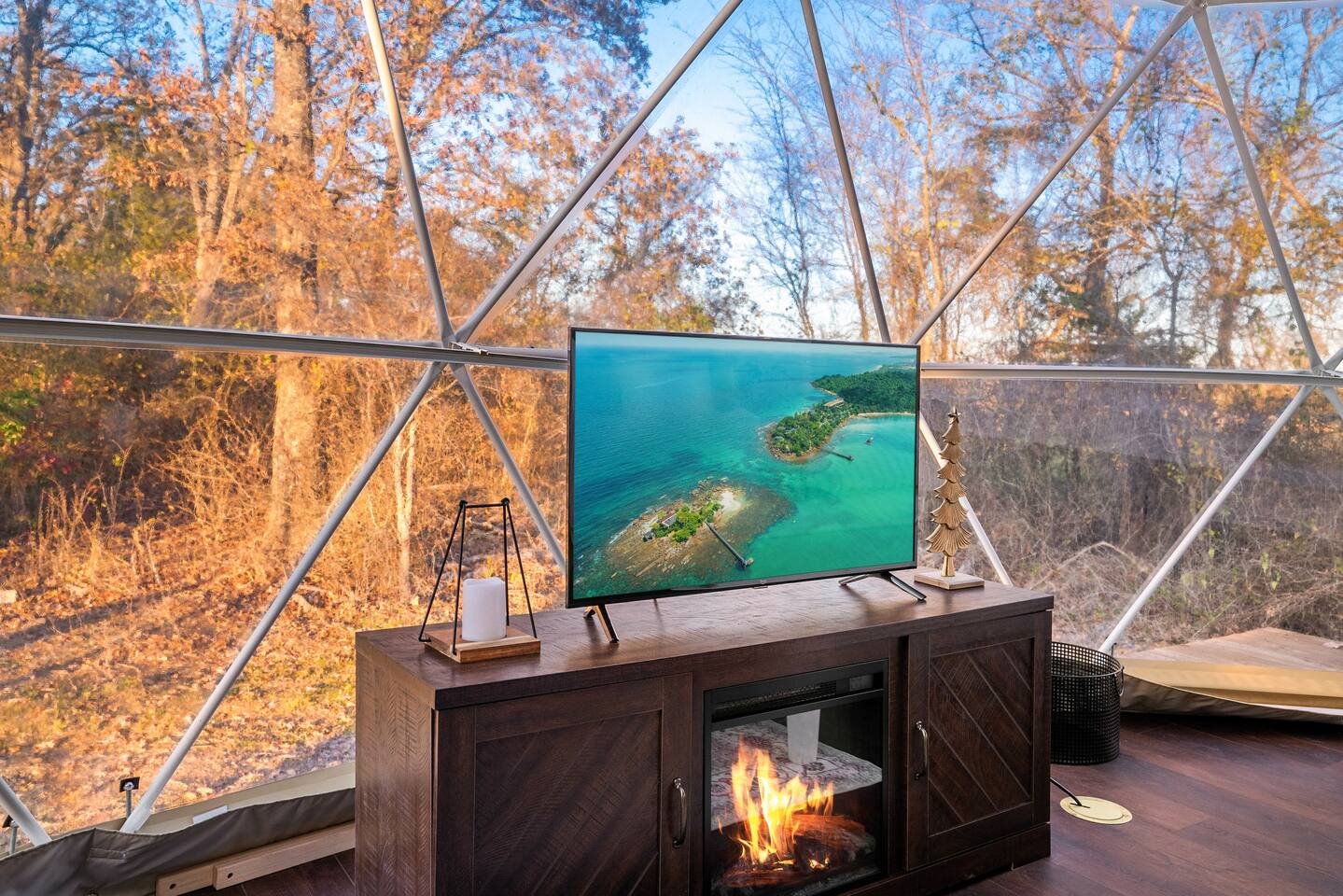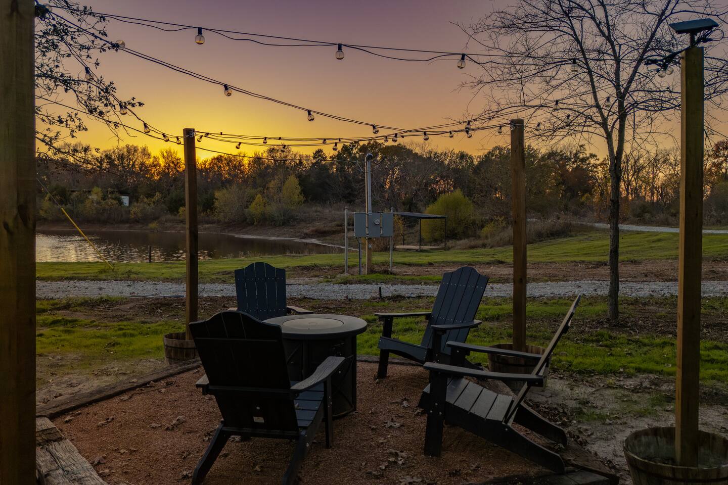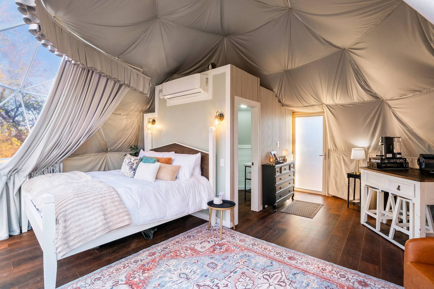 Inside, enjoy a cozy living space featuring a luxurious king-sized bed, a spacious full bathroom, and a stunning panoramic window—perfect for stargazing from the comfort of your bed. The high-powered mini-split system ensures a comfortable stay year-round, keeping you warm on chilly evenings and cool during the warm Texas summers. Step outside to your private deck, where you can sip coffee by the soothing fountain, or gather around the firepit beneath a canopy of trees. Explore the property’s walking trails, fish in the peaceful ponds (catch-and-release and provide your own fishing supplies), or simply relax and soak in the sounds of nature, all while basking in the splendor of Texas sunsets. Whether you're seeking to disconnect from the world or reconnect with loved ones, the Sunset Dome is your perfect hideaway.