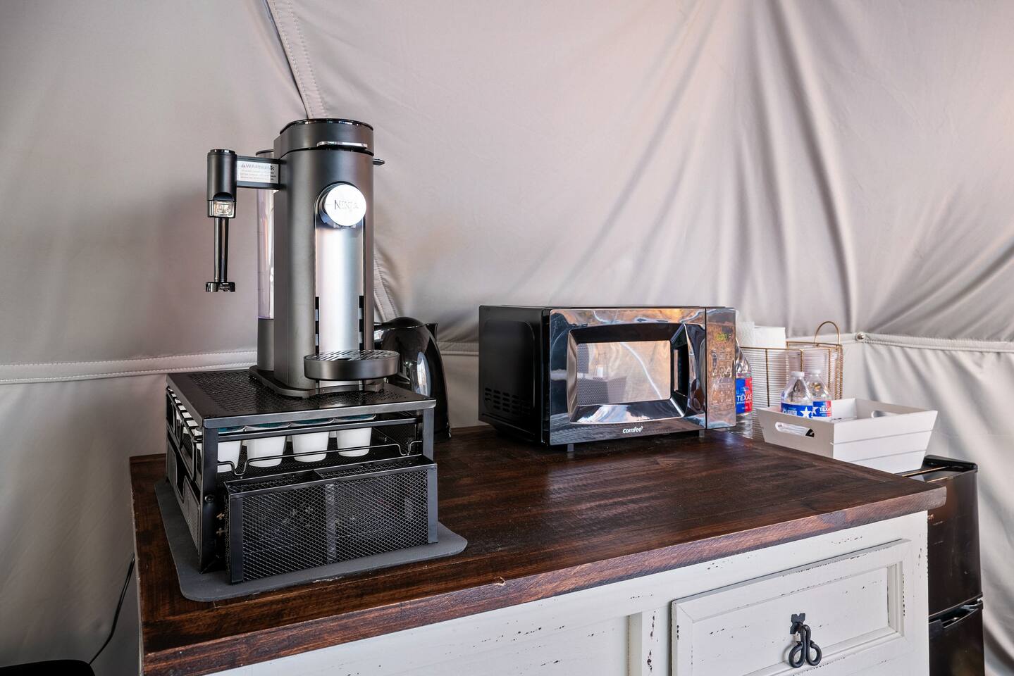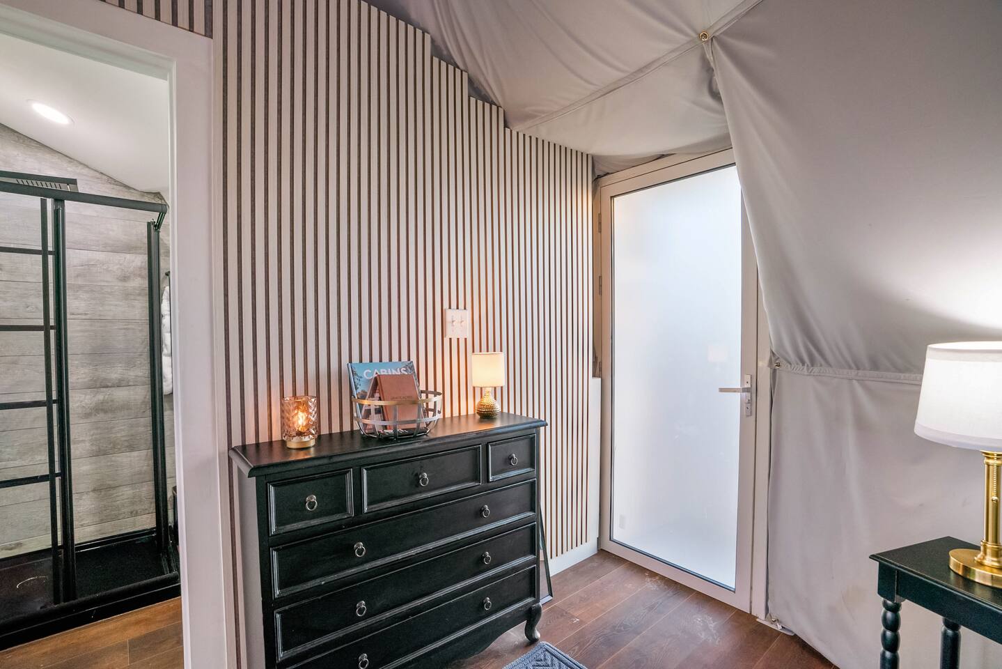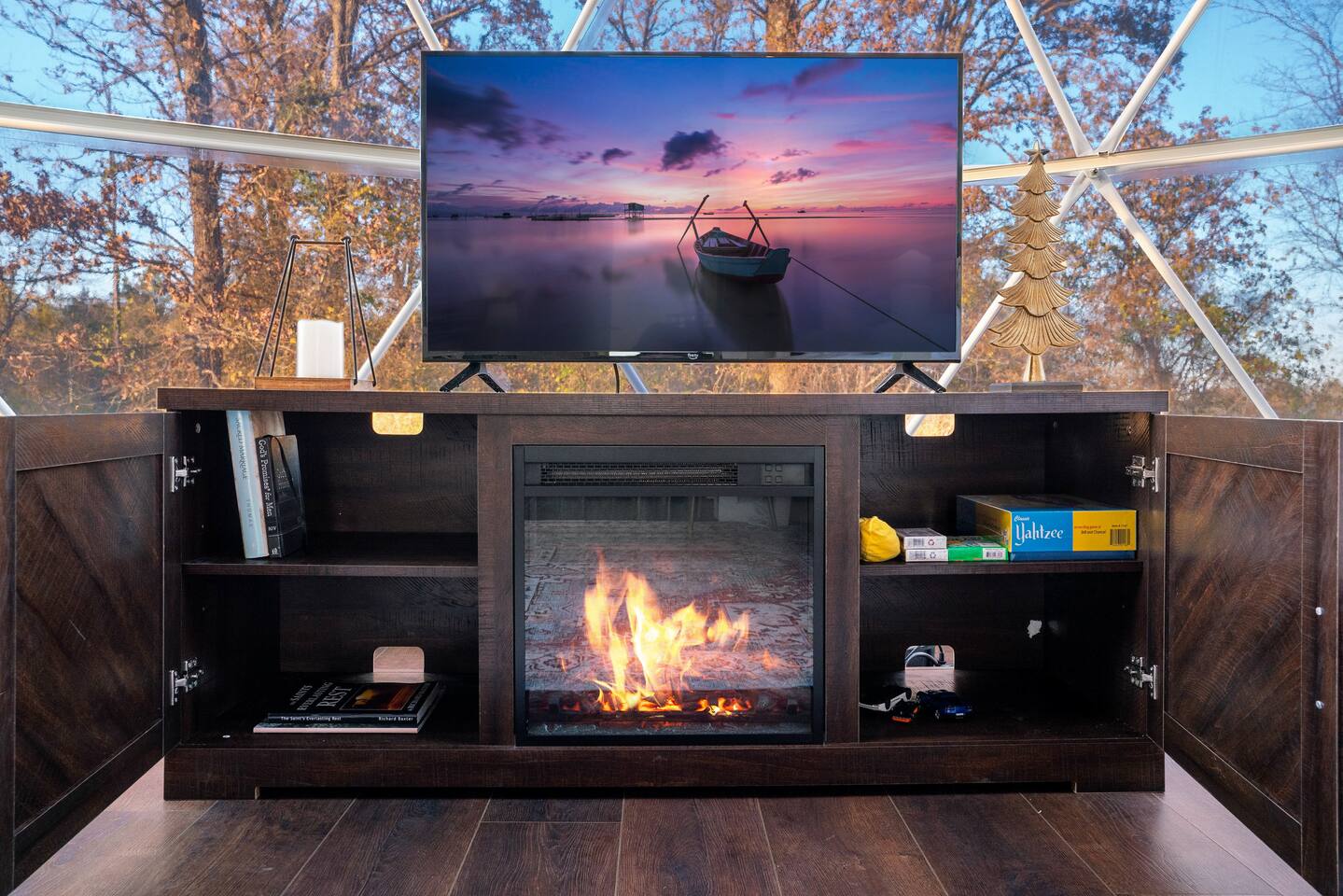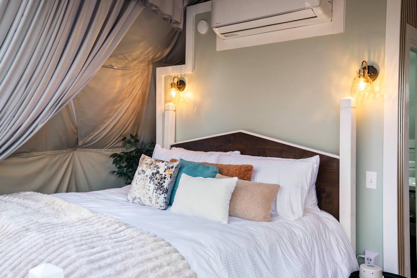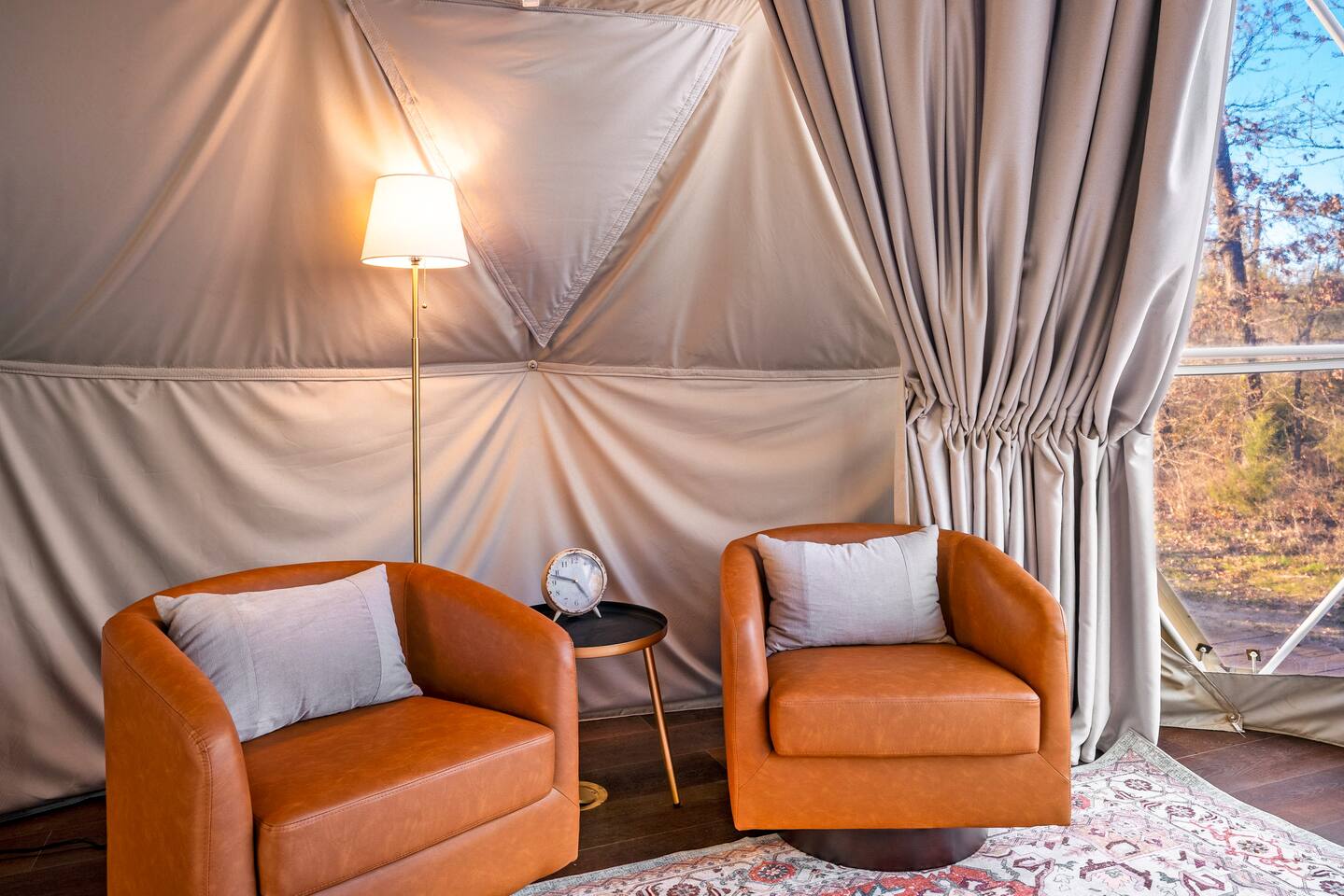 Inside, enjoy a cozy living space featuring a luxurious king-sized bed, a spacious full bathroom, and a stunning panoramic window—perfect for stargazing from the comfort of your bed. The high-powered mini-split system ensures a comfortable stay year-round, keeping you warm on chilly evenings and cool during the warm Texas summers. Step outside to your private deck, where you can sip coffee by the soothing fountain, or gather around the firepit beneath a canopy of trees. Explore the property’s walking trails, fish in the peaceful ponds (catch-and-release and provide your own fishing supplies), or simply relax and soak in the sounds of nature, all while basking in the splendor of Texas sunsets. Whether you're seeking to disconnect from the world or reconnect with loved ones, the Sunset Dome is your perfect hideaway.